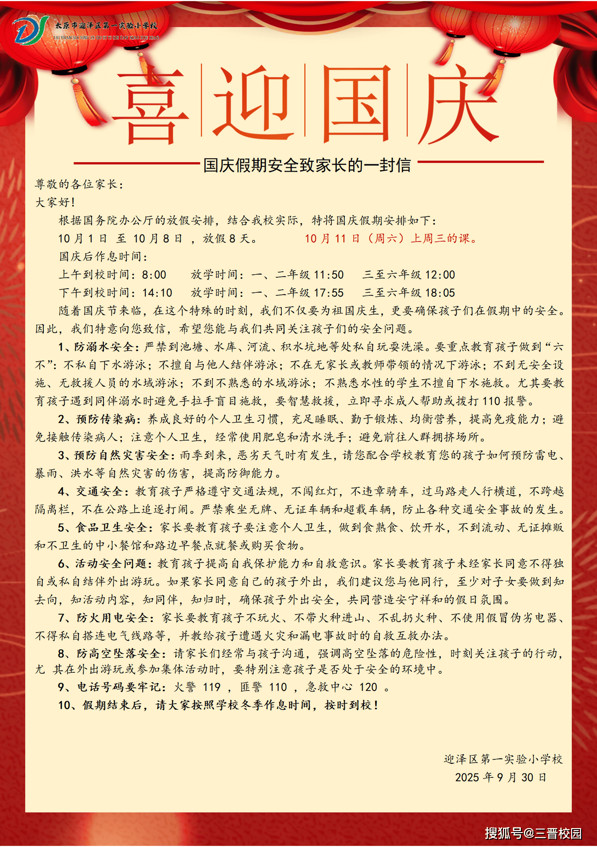 为进一步强化家校联动,学校还同一印制并发放了 《国庆假期平安致家长的一封信》。信中细致列出了假期期间需家长亲近关心的各项平安留意事项,包罗交通平安、饮食卫生、防溺水、居家平安等,呼吁家长切实履行监护职责,加强对后代假期的监管取陪同,取学校联袂配合为孩子的平安保驾护航。