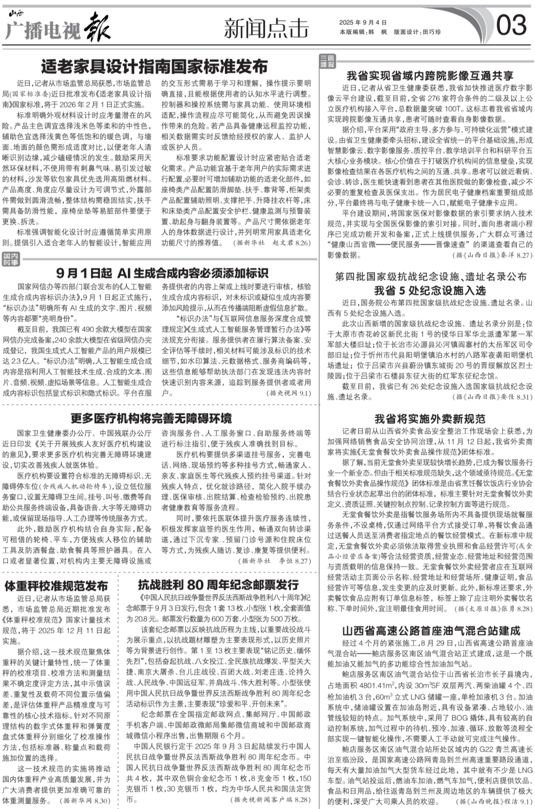 国度网信办等四部分结合发布的《人工智能生成合成内容标识法子》,9月1日起正式施行,“标识法子”明白所有AI生成的文字、图片、视频等内容都要“亮明身份”。截至目前,我国已有490余款大模子正在国度网信办完成存案,240余款大模子正在省级网信办完成登记,我国生成式人工智能产物的用户规模已达2。3亿人。“标识法子”明白,人工智能生成合成内容是指操纵人工智能手艺生成、合成的文本、图片、音频、视频、虚拟场景等消息。人工智能生成合成内容标识包罗显式标识和现式标识。平台正在办事供给者的内容上架或上线时要进行审核,核验生成合成内容标识,对未标识或疑似生成内容要添加风险提醒,从而正在端阻断虚假消息扩散。国度卫生健康委办公厅、中国残联办公厅近日印发《关于开展残疾人敌对医疗机构扶植的看法》,要求更多医疗机构完美无妨碍扶植,切实改善残疾人就医体验。医疗机构要设置合适尺度的无妨碍标识、无妨碍泊车位(含残疾人灵活轮椅车),设立低位办事窗口,设置无妨碍卫生间。挂号、叫号、缴费等自帮公共办事终端设备,具备语音、大字等无妨碍功能,或保留现场指点、人工打点等保守办事体例。此外,激励医疗机构连系本身现实,配备可租借的轮椅、平车,便利残疾人移位的辅帮东西及防洒餐盘、帮食餐具等照护器具。正在入口或者显著,对机构内次要无妨碍设备或征询办事台、人工办事窗口、自帮办事终端等进行标注,便于残疾人精确找到方针。医疗机构要供给多渠道挂号办事,完美德律风、收集、现场预定等多种挂号体例,通顺家人、亲朋、家庭大夫等代残疾人预定挂号渠道。针对残疾人特点,优化就诊路径,简化入院手续打点、医保审核、出院结算、查抄查验预定、出院患者健康教育等办事流程。同时,要依托医联体提拔医疗办事持续性,积极阐扬家庭签约大夫感化,通顺双向转诊渠道,通过下沉专家。、预留门诊号源和住院床位等体例,为残疾人随访、复诊、康复等供给便当。近日,记者从市场监管总局获悉,市场监管总局近期核准发布《体沉秤校准规范》国度计量手艺规范,将于2025年12月11日起实施。据引见,这一手艺规范聚焦体沉秤的环节计量特征,同一了体沉秤的校准项目、校准方式和丈量成果不确定度评定方式,此中示值误差、反复性及载荷分歧示值误差,是评估体沉秤产物精准度取靠得住性的焦点手艺目标。针对分歧志理布局的数字式体沉秤和弹簧度盘式体沉秤别离细化了校准操做方式,包罗尺度器、称量点和载荷的选择。这一手艺规范的实施将鞭策国内体沉秤财产高质量成长,并为泛博消费者供给愈加精确靠得住的体沉丈量办事。(据新华网8。30)《中国人平易近抗日和平暨世界反和平胜利八十周年》留念邮票于9月3日刊行,包含1套13枚、小型张1枚,全套面值为20。8元。邮票刊行数量为600万套、小型张为500万枚。该套留念邮票以反映抗和过程为从线,以主要和役和役为展现沉点,以抗和题材雕塑为次要表示形式,以汗青照片等为布景进行创做。第1至13枚次要表示“铭刻汗青、怀想先烈”,包罗奋起抗和、八女投江、全平易近族抗和迸发、平型关大捷、南京大、台儿庄和役、百团大和、刘老庄连、论持久和、、中国远征军、并肩和役、伟大胜利等。小型张利用中国人平易近抗日和平暨世界反和平胜利80周年留念勾当标识做为从景,次要表示“珍爱和平、开创将来”。留念邮票正在全国指定邮政网点、集邮网厅、中国邮政手机客户端、中国邮政微邮局集邮微信商城和中国邮政商城微信小法式出售,出售刻日6个月。中国人平易近银行定于2025年9月3日起连续刊行中国人平易近抗日和平暨世界反和平胜利80周年留念币。中国人平易近抗日和平暨世界反和平胜利80周年留念币共4枚,此中双色铜合金留念币1枚,8克金币1枚,150克银币1枚,30克银币1枚,均为中华人平易近国货泉。(据央视旧事客户端8。28)